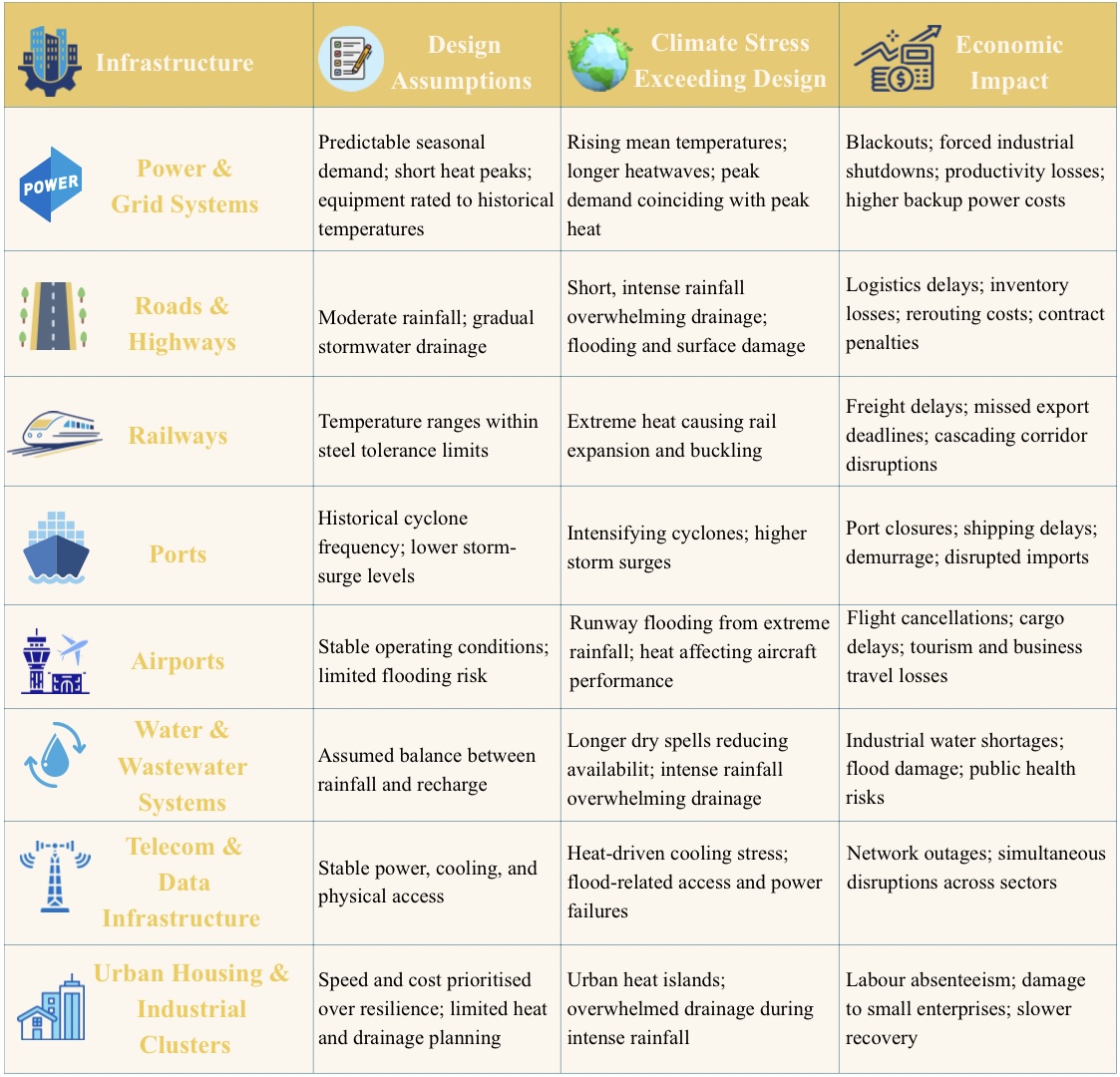 When hazard patterns change, the implications for infrastructure are not abstract; they are regional, cumulative, and deeply economic. Consider India’s western coastline, historically less exposed to frequent severe cyclones than the east. Ports, airports, industrial corridors, and urban centres along this coast were therefore designed for lower storm intensity and limited storm surge. Today, warming in the Arabian Sea is altering that risk profile. Stronger cyclones are now intersecting with sea-level rise, extreme rainfall, rising heat stress, and an increase in warm nights, creating compound hazards in one of India’s most economically active regions. For infrastructure clustered along the coast, this means more frequent operational shutdowns, damage to high-value assets, and repeated business interruption rather than one-off losses. The consequences extend beyond physical damage: disrupted trade flows, stranded capital investment, lost jobs, and heightened risks to lives and livelihoods in dense urban and industrial zones. When ports, airports, power systems, and transport links are exposed to multiple, overlapping hazards, recovery slows and losses compound, turning regional climate stress into systemic economic risk.